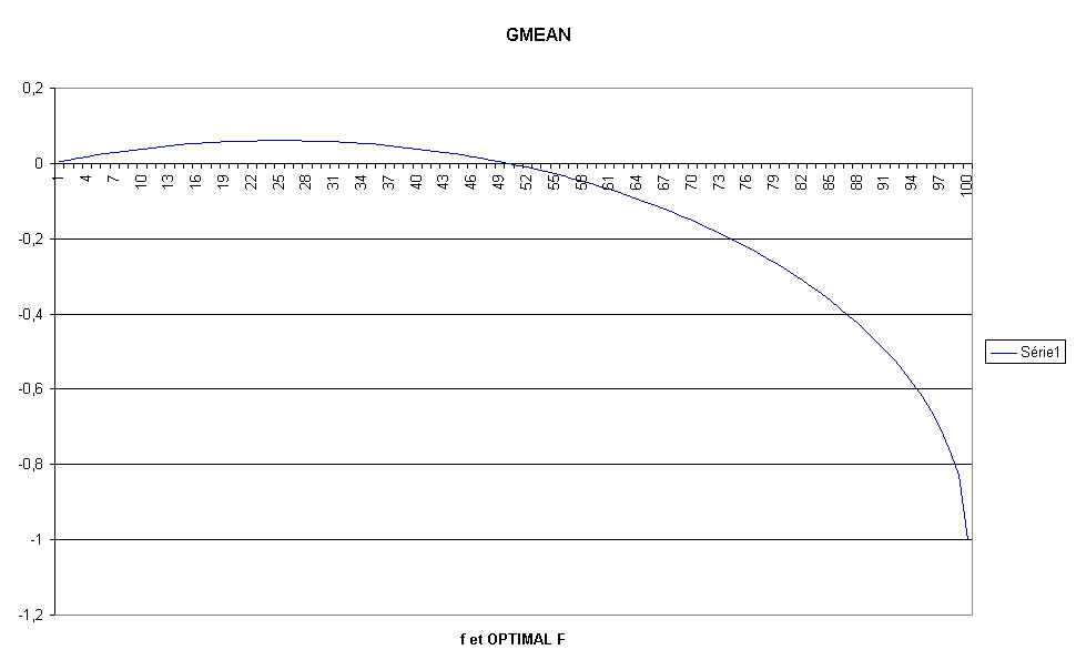 Ci dessous, vous trouverez la courbe du Gmean en fonction de f, et vous remarquerez que le maximum de rentabilité est à f = 0.25 et que cette rentabilité décrois rapidement de chaque coté du maximum, et que la stratégie devient perdante au delà de f = 50.